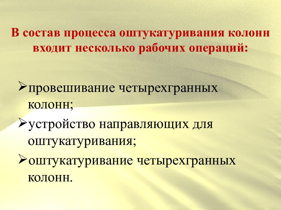 Слайд 10: В состав процесса оштукатуривания колонн входит несколько рабочих операций: