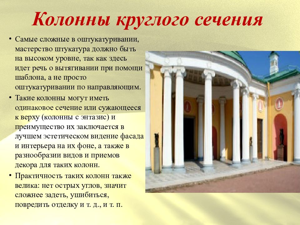 Самые сложные в оштукатуривании, мастерство штукатура должно быть на высоком уровне, так как здесь идет речь о вытягивании при помощи шаблона, а не просто оштукатуривании по направляющим. Такие колонны могут иметь одинаковое сечение или сужающееся к верху (колонны с энтазис) и преимущество их заключается в лучшем эстетическом видение фасада и интерьера на их фоне, а также в разнообразии видов и приемов декора для таких колонн. Практичность таких колонн также велика: нет острых углов, значит сложнее задеть, ушибиться, повредить отделку и т. д., и т. п.