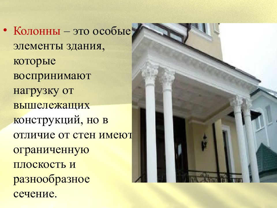 Колонны – это особые элементы здания, которые воспринимают нагрузку от вышележащих конструкций, но в отличие от стен имеют ограниченную плоскость и разнообразное сечение.