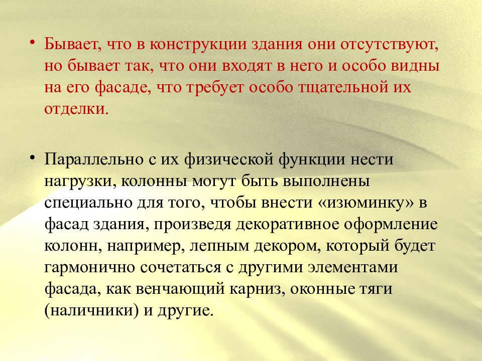 Бывает, что в конструкции здания они отсутствуют, но бывает так, что они входят в него и особо видны на его фасаде, что требует особо тщательной их отделки. Параллельно с их физической функции нести нагрузки, колонны могут быть выполнены специально для того, чтобы внести «изюминку» в фасад здания, произведя декоративное оформление колонн, например, лепным декором, который будет гармонично сочетаться с другими элементами фасада, как венчающий карниз, оконные тяги (наличники) и другие.