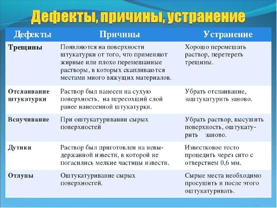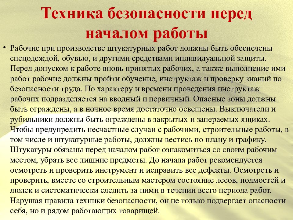 Рабочие при производстве штукатурных работ должны быть обеспечены спецодеждой, обувью, и другими средствами индивидуальной защиты. Перед допуском к работе вновь принятых рабочих, а также выполнение ими работ рабочие должны пройти обучение, инструктаж и проверку знаний по безопасности труда. По характеру и времени проведения инструктаж рабочих подразделяется на вводный и первичный. Опасные зоны должны быть ограждены, а в ночное время достаточно освещены. Выключатели и рубильники должны быть ограждены в закрытых и запераемых ящиках. Чтобы предупредить несчастные случаи с рабочими, строительные работы, в том числе и штукатурные работы, должны вестись по плану и графику. Штукатуры обязаны перед началом работ ознакомиться со своим рабочим местом, убрать все лишние предметы. До начала работ рекомендуется осмотреть и проверить инструмент и исправить все дефекты. Осмотреть и проверить, вместе со строительным мастером состояние лесов, подмостей и люлек и систематически следить за ними в течении всего периода работ. Нарушая правила техники безопасности, он не только подвергает опасности себя, но и рядом работающих товарищей.