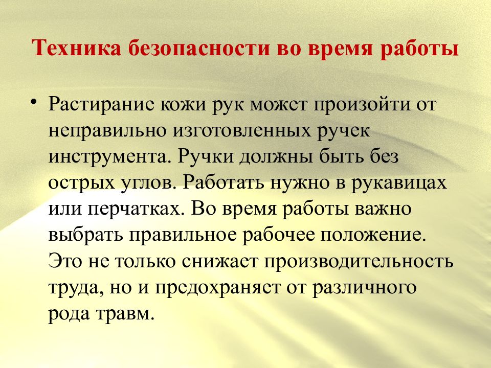Растирание кожи рук может произойти от неправильно изготовленных ручек инструмента. Ручки должны быть без острых углов. Работать нужно в рукавицах или перчатках. Во время работы важно выбрать правильное рабочее положение. Это не только снижает производительность труда, но и предохраняет от различного рода травм.