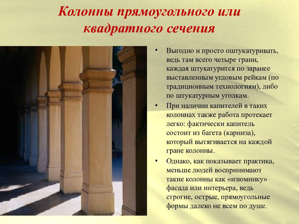 Выгодно и просто оштукатуривать, ведь там всего четыре грани, каждая штукатурится по заранее выставленным угловым рейкам (по традиционным технологиям), либо по штукатурным уголкам. При наличии капителей в таких колоннах также работа протекает легко: фактически капитель состоит из багета (карниза), который вытягивается на каждой гране колонны. Однако, как показывает практика, меньше людей воспринимают такие колонны как «изюминку» фасада или интерьера, ведь строгие, острые, прямоугольные формы далеко не всем по душе.