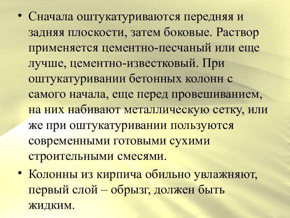 Сначала оштукатуриваются передняя и задняя плоскости, затем боковые. Раствор применяется цементно-песчаный или еще лучше, цементно-известковый. При оштукатуривании бетонных колонн с самого начала, еще перед провешиванием, на них набивают металлическую сетку, или же при оштукатуривании пользуются современными готовыми сухими строительными смесями. Колонны из кирпича обильно увлажняют, первый слой – обрызг, должен быть жидким.