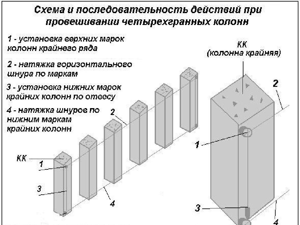 При выполнении работ нужно учитывать: угол поворота – 90 градусов по отношению к каждой грани, прямолинейность лицевых и торцевых граней и их уровень по вертикали а также (само с собой) – отклонения по плоскости в вертикальном и горизонтальном направлениях. Грани всех колонн, идущих в ряд должны быть одинаковой ширины – это и все вышесказанное учитывается при провешивании.