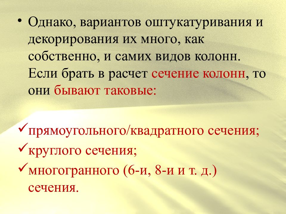 Однако, вариантов оштукатуривания и декорирования их много, как собственно, и самих видов колонн. Если брать в расчет сечение колонн, то они бывают таковые: прямоугольного/квадратного сечения; круглого сечения; многогранного (6-и, 8-и и т. д.) сечения.