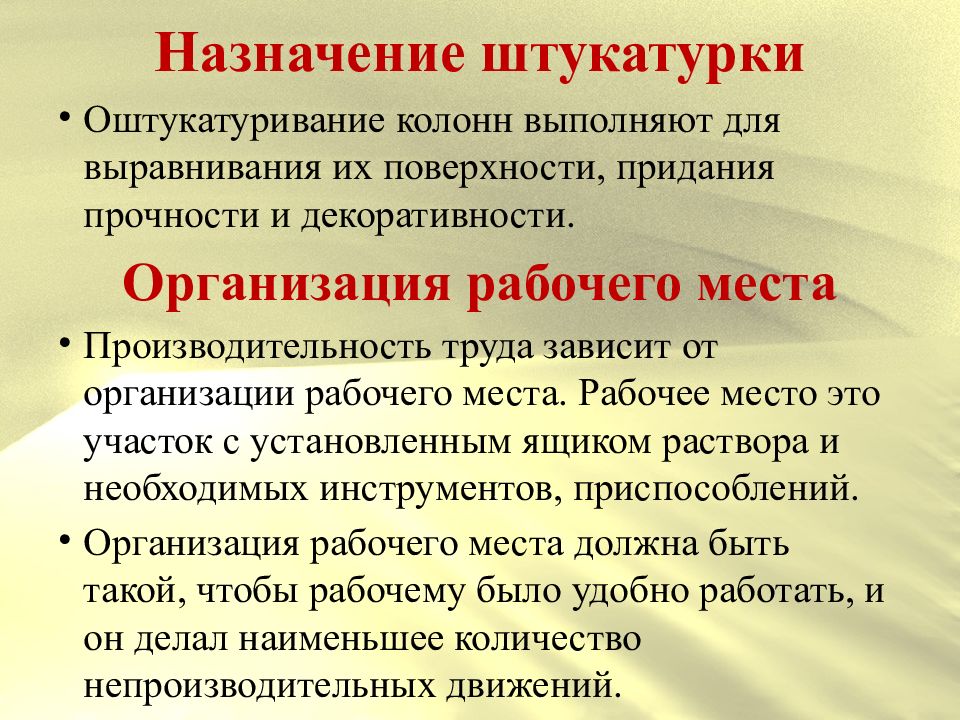 Оштукатуривание колонн выполняют для выравнивания их поверхности, придания прочности и декоративности. Организация рабочего места Производительность труда зависит от организации рабочего места. Рабочее место это участок с установленным ящиком раствора и необходимых инструментов, приспособлений. Организация рабочего места должна быть такой, чтобы рабочему было удобно работать, и он делал наименьшее количество непроизводительных движений.