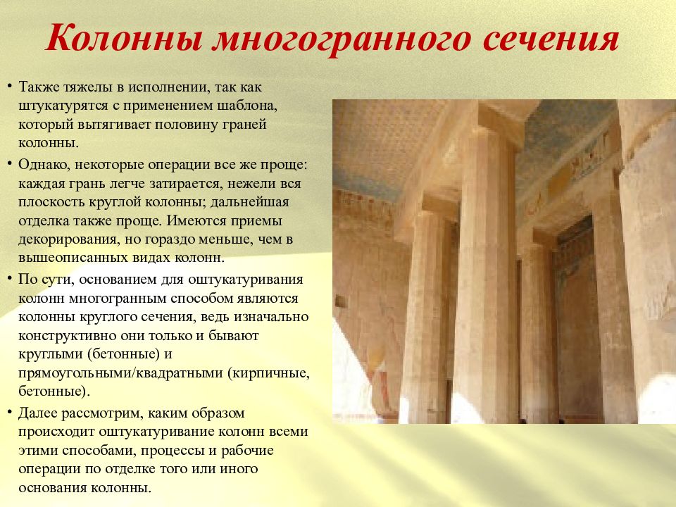 Также тяжелы в исполнении, так как штукатурятся с применением шаблона, который вытягивает половину граней колонны. Однако, некоторые операции все же проще: каждая грань легче затирается, нежели вся плоскость круглой колонны; дальнейшая отделка также проще. Имеются приемы декорирования, но гораздо меньше, чем в вышеописанных видах колонн. По сути, основанием для оштукатуривания колонн многогранным способом являются колонны круглого сечения, ведь изначально конструктивно они только и бывают круглыми (бетонные) и прямоугольными/квадратными (кирпичные, бетонные ). Далее рассмотрим, каким образом происходит оштукатуривание колонн всеми этими способами, процессы и рабочие операции по отделке того или иного основания колонны.