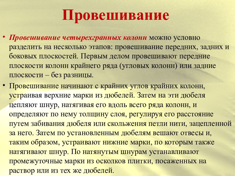 Провешивание четырехгранных колонн можно условно разделить на несколько этапов: провешивание передних, задних и боковых плоскостей. Первым делом провешивают передние плоскости колонн крайнего ряда (угловых колонн) или задние плоскости – без разницы. Провешивание начинают с крайних углов крайних колонн, устраивая верхние марки из дюбелей. Затем на эти дюбеля цепляют шнур, натягивая его вдоль всего ряда колонн, и определяют по нему толщину слоя, регулируя его расстояние путем забивания дюбеля или скольжения петли нити, зацепленной за него. Затем по установленным дюбелям вешают отвесы и, таким образом, устраивают нижние марки, по которым также натягивают шнур. По натянутым шнурам устанавливают промежуточные марки из осколков плитки, посаженных на раствор или из тех же дюбелей.