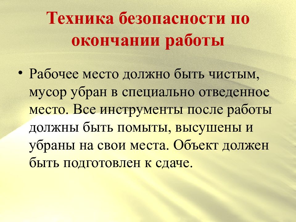 Последний слайд презентации: Технология подготовки и оштукатуривания квадратных колонн: Техника безопасности по окончании работы