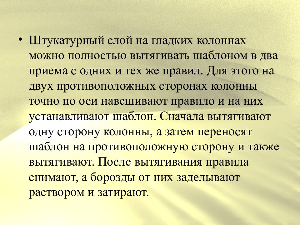 Штукатурный слой на гладких колоннах можно полностью вытягивать шаблоном в два приема с одних и тех же правил. Для этого на двух противоположных сторонах колонны точно по оси навешивают правило и на них устанавливают шаблон. Сначала вытягивают одну сторону колонны, а затем переносят шаблон на противоположную сторону и также вытягивают. После вытягивания правила снимают, а борозды от них заделывают раствором и затирают.