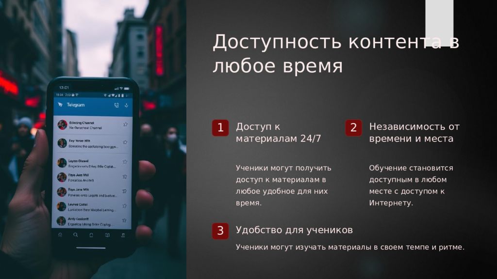 Доступность контента в любое время 1 Доступ к материалам 24/7 Ученики могут получить доступ к материалам в любое удобное для них время. 2 Независимость от времени и места Обучение становится доступным в любом месте с доступом к Интернету. 3 Удобство для учеников Ученики могут изучать материалы в своем темпе и ритме.