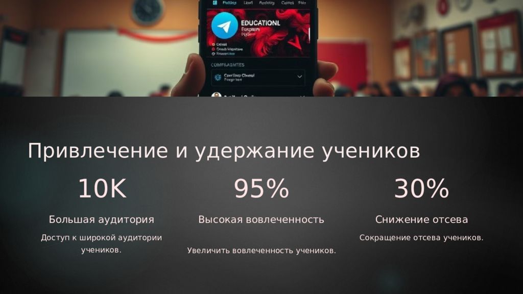 Привлечение и удержание учеников 10K Большая аудитория Доступ к широкой аудитории учеников. 95% Высокая вовлеченность Увеличить вовлеченность учеников. 30% Снижение отсева Сокращение отсева учеников.