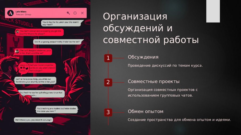 Организация обсуждений и совместной работы 1 Обсуждения Проведение дискуссий по темам курса. 2 Совместные проекты Организация совместных проектов с использованием групповых чатов. 3 Обмен опытом Создание пространства для обмена опытом и идеями.