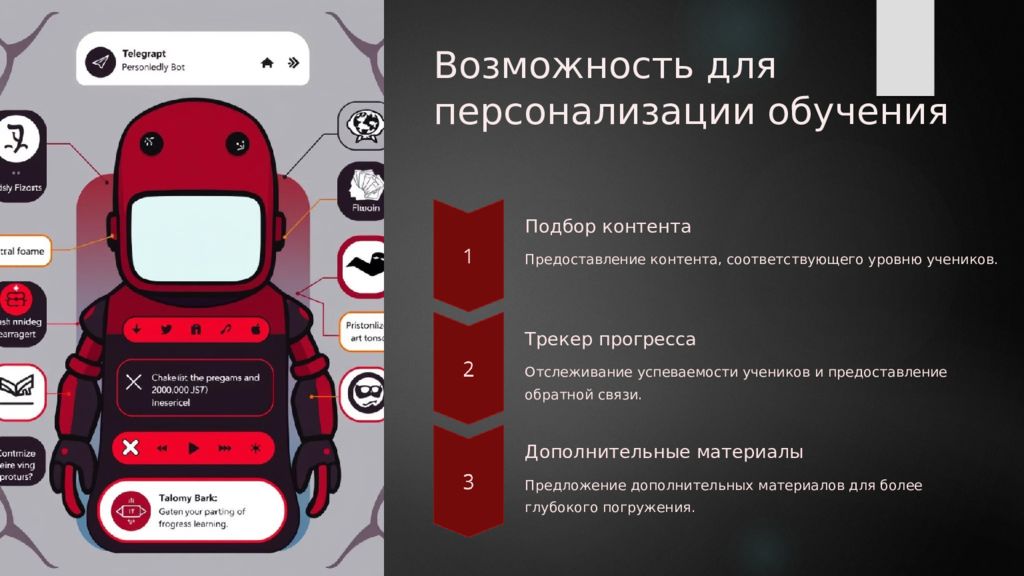 Возможность для персонализации обучения Подбор контента Предоставление контента, соответствующего уровню учеников. Трекер прогресса Отслеживание успеваемости учеников и предоставление обратной связи. Дополнительные материалы Предложение дополнительных материалов для более глубокого погружения.