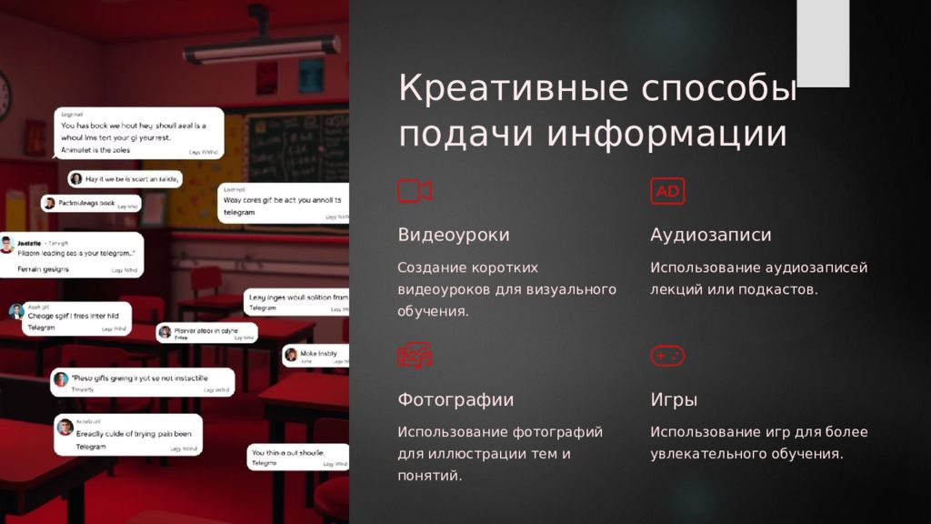 Креативные способы подачи информации Видеоуроки Создание коротких видеоуроков для визуального обучения. Аудиозаписи Использование аудиозаписей лекций или подкастов. Фотографии Использование фотографий для иллюстрации тем и понятий. Игры Использование игр для более увлекательного обучения.