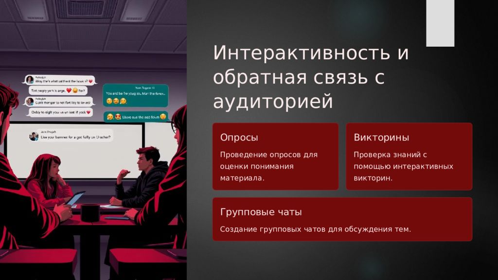 Интерактивность и обратная связь с аудиторией Опросы Проведение опросов для оценки понимания материала. Викторины Проверка знаний с помощью интерактивных викторин. Групповые чаты Создание групповых чатов для обсуждения тем.
