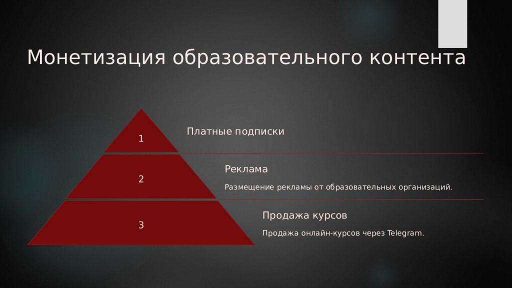 Монетизация образовательного контента 1 Платные подписки 2 Реклама Размещение рекламы от образовательных организаций. 3 Продажа курсов Продажа онлайн-курсов через Telegram.