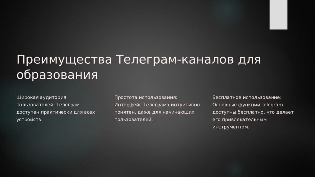 Преимущества Телеграм-каналов для образования Широкая аудитория пользователей: Телеграм доступен практически для всех устройств. Простота использования: Интерфейс Телеграма интуитивно понятен, даже для начинающих пользователей. Бесплатное использование: Основные функции Telegram доступны бесплатно, что делает его привлекательным инструментом.