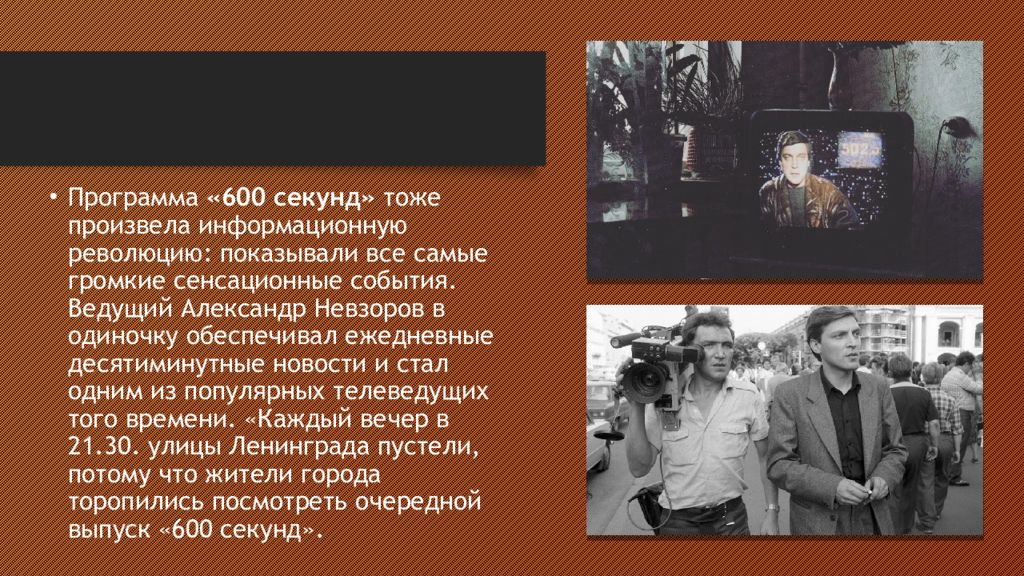 Программа «600 секунд» тоже произвела информационную революцию: показывали все самые громкие сенсационные события. Ведущий Александр Невзоров в одиночку обеспечивал ежедневные десятиминутные новости и стал одним из популярных телеведущих того времени. «Каждый вечер в 21.30. улицы Ленинграда пустели, потому что жители города торопились посмотреть очередной выпуск «600 секунд».
