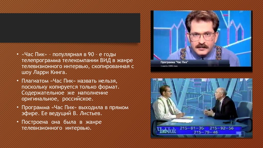 «Час Пик» – популярная в 90 – е годы телепрограмма телекомпании ВИД в жанре телевизионного интервью, скопированная с шоу Ларри Кинга. Плагиатом «Час Пик» назвать нельзя, поскольку копируется только формат. Содержательное же наполнение оригинальное, российское. Программа «Час Пик» выходила в прямом эфире. Ее ведущий В. Листьев. Построена она была в жанре телевизионного интервью.