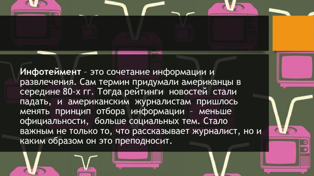 Инфотеймент – это сочетание информации и развлечения. Сам термин придумали американцы в середине 80-х гг. Тогда рейтинги новостей стали падать, и американским журналистам пришлось менять принцип отбора информации – меньше официальности, больше социальных тем. Стало важным не только то, что рассказывает журналист, но и каким образом он это преподносит.