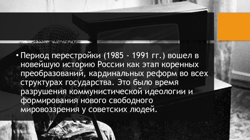 Период перестройки (1985 - 1991 гг.) вошел в новейшую историю России как этап коренных преобразований, кардинальных реформ во всех структурах государства. Это было время разрушения коммунистической идеологии и формирования нового свободного мировоззрения у советских людей.