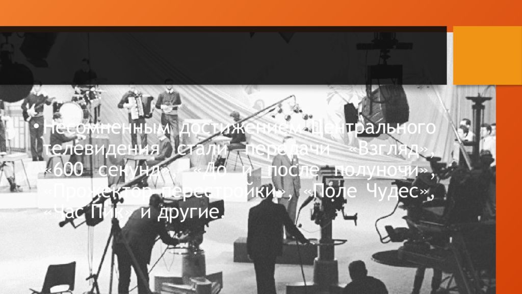 Несомненным достижением Центрального телевидения стали передачи «Взгляд», «600 секунд», «До и после полуночи», «Прожектор перестройки», «Поле Чудес», «Час Пик» и другие.