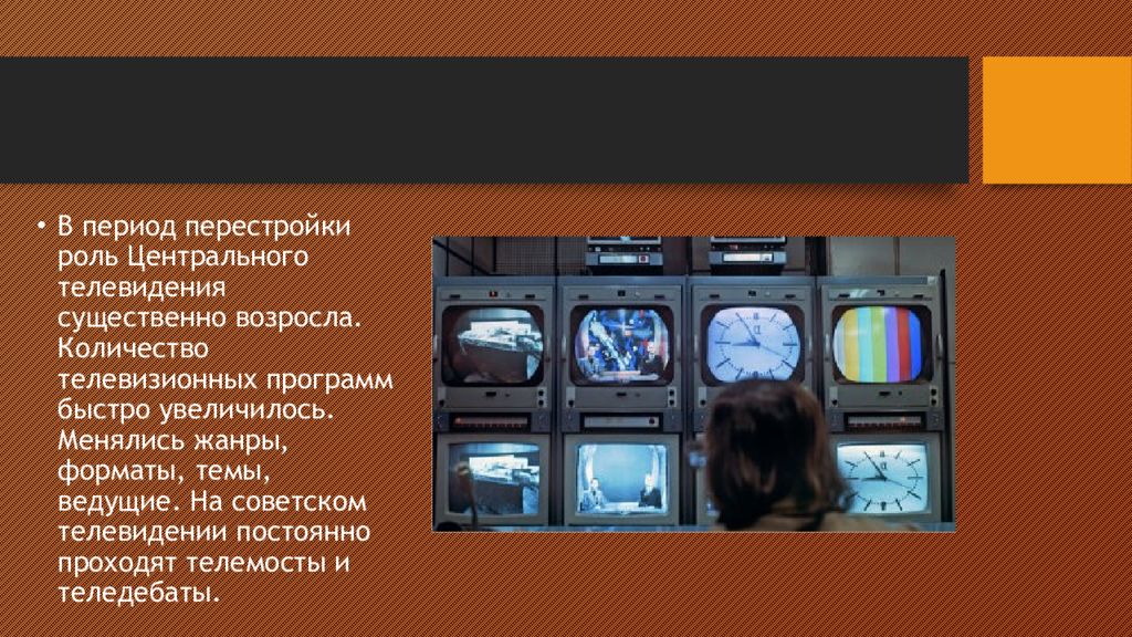 В период перестройки роль Центрального телевидения существенно возросла. Количество телевизионных программ быстро увеличилось. Менялись жанры, форматы, темы, ведущие. На советском телевидении постоянно проходят телемосты и теледебаты.