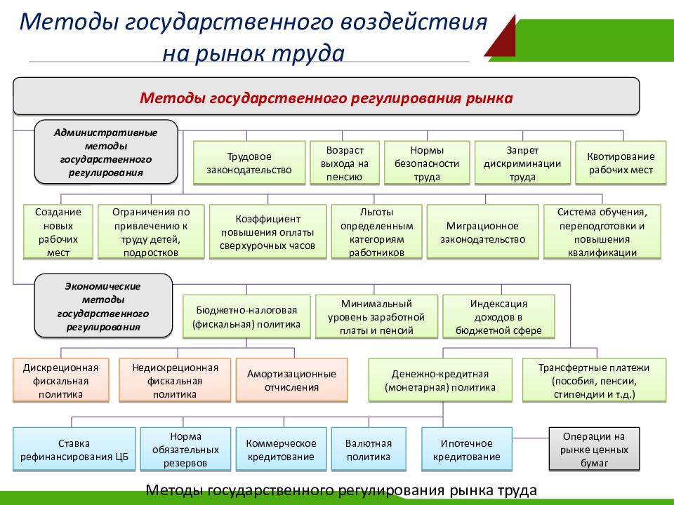 Методы государственного регулирования рынка Административные методы государственного регулирования Трудовое законодательство Возраст выхода на пенсию Нормы безопасности труда Запрет дискриминации труда Квотирование рабочих мест Создание новых рабочих мест Ограничения по привлечению к труду детей, подростков Коэффициент повышения оплаты сверхурочных часов Льготы определенным категориям работников Миграционное законодательство Система обучения, переподготовки и повышения квалификации Экономические методы государственного регулирования Бюджетно-налоговая (фискальная) политика Дискреционная фискальная политика Недискреционная фискальная политика Амортизационные отчисления Минимальный уровень заработной платы и пенсий Индексация доходов в бюджетной сфере Денежно-кредитная (монетарная) политика Трансфертные платежи (пособия, пенсии, стипендии и т.д.) Ставка рефинансирования ЦБ Норма обязательных резервов Коммерческое кредитование Валютная политика Ипотечное кредитование Операции на рынке ценных бумаг Методы государственного регулирования рынка труда