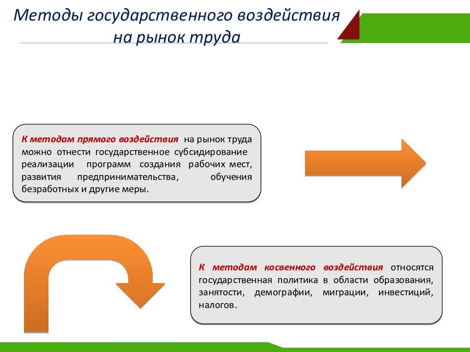К методам косвенного воздействия относятся государственная политика в области образования, занятости, демографии, миграции, инвестиций, налогов. К методам прямого воздействия на рынок труда можно отнести государственное субсидирование реализации программ создания рабочих мест, развития предпринимательства, обучения безработных и другие меры.