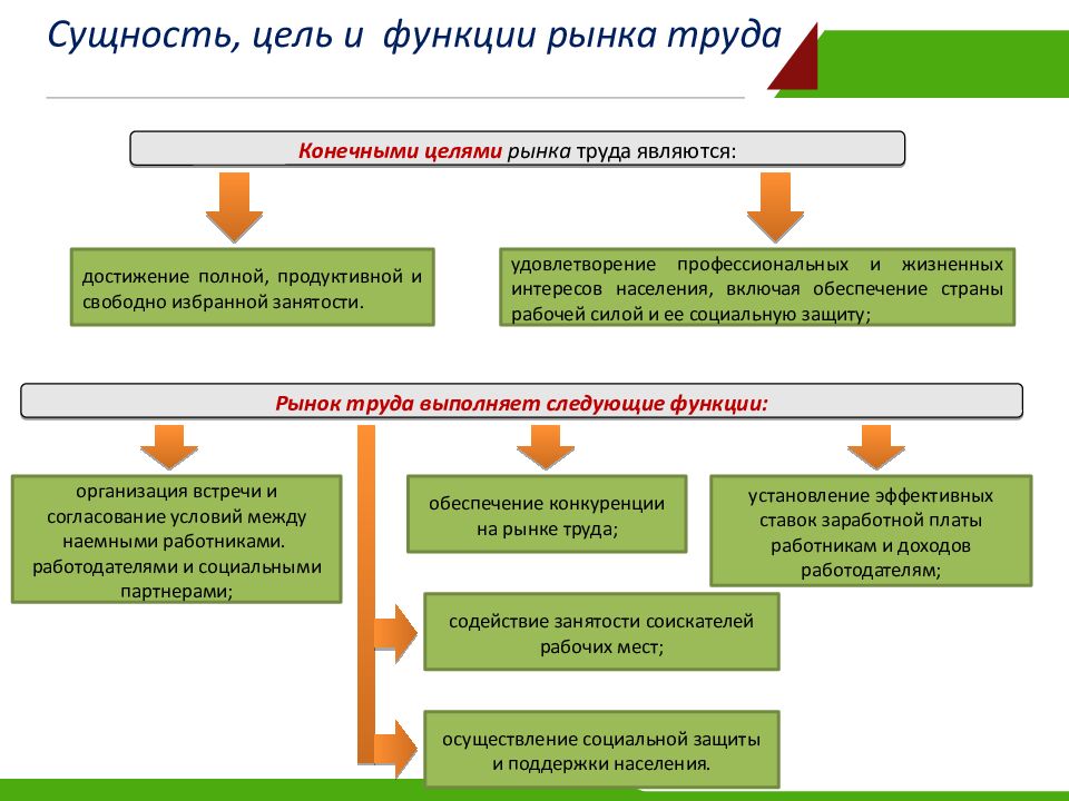 достижение полной, продуктивной и свободно избранной занятости. удовлетворение профессиональных и жизненных интересов населения, включая обеспечение страны рабочей силой и ее социальную защиту; Конечными целями рынка труда являются: организация встречи и согласование условий между наемными работниками. работодателями и социальными партнерами; обеспечение конкуренции на рынке труда; Рынок труда выполняет следующие функции: установление эффективных ставок заработной платы работникам и доходов работодателям; содействие занятости соискателей рабочих мест; осуществление социальной защиты и поддержки населения.