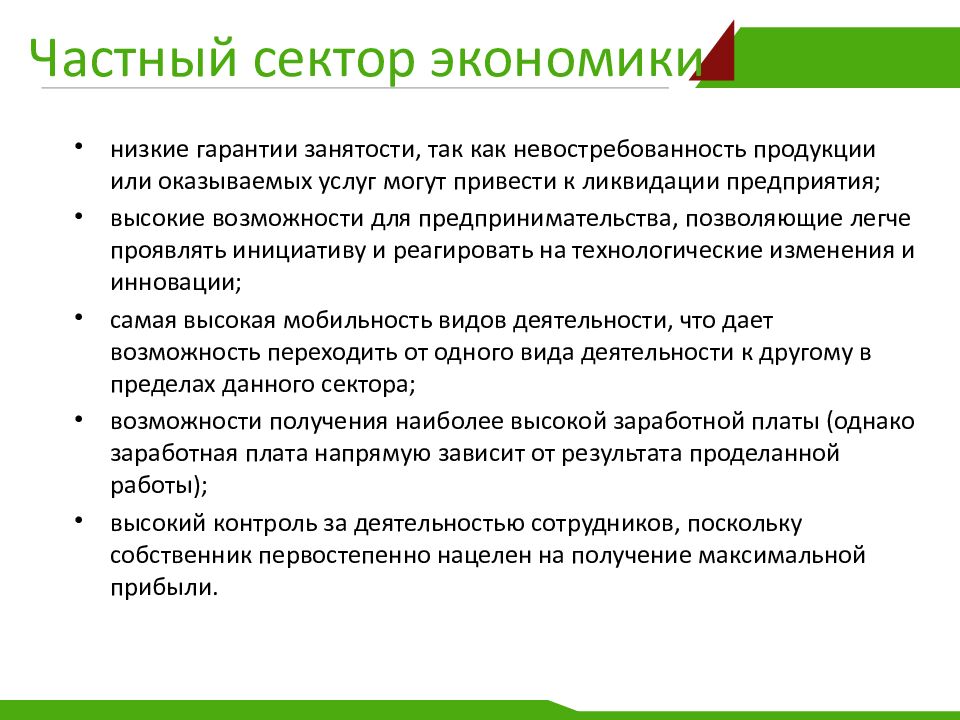 низкие гарантии занятости, так как невостребованность продукции или оказываемых услуг могут привести к ликвидации предприятия; высокие возможности для предпринимательства, позволяющие легче проявлять инициативу и реагировать на технологические изменения и инновации; самая высокая мобильность видов деятельности, что дает возможность переходить от одного вида деятельности к другому в пределах данного сектора; возможности получения наиболее высокой заработной платы (однако заработная плата напрямую зависит от результата проделанной работы); высокий контроль за деятельностью сотрудников, поскольку собственник первостепенно нацелен на получение максимальной прибыли.