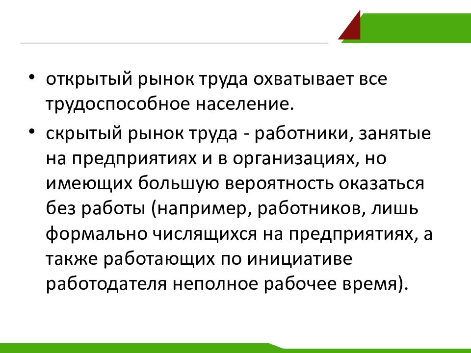 открытый рынок труда охватывает все трудоспособное население. скрытый рынок труда - работники, занятые на предприятиях и в организациях, но имеющих большую вероятность оказаться без работы (например, работников, лишь формально числящихся на предприятиях, а также работающих по инициативе работодателя неполное рабочее время).