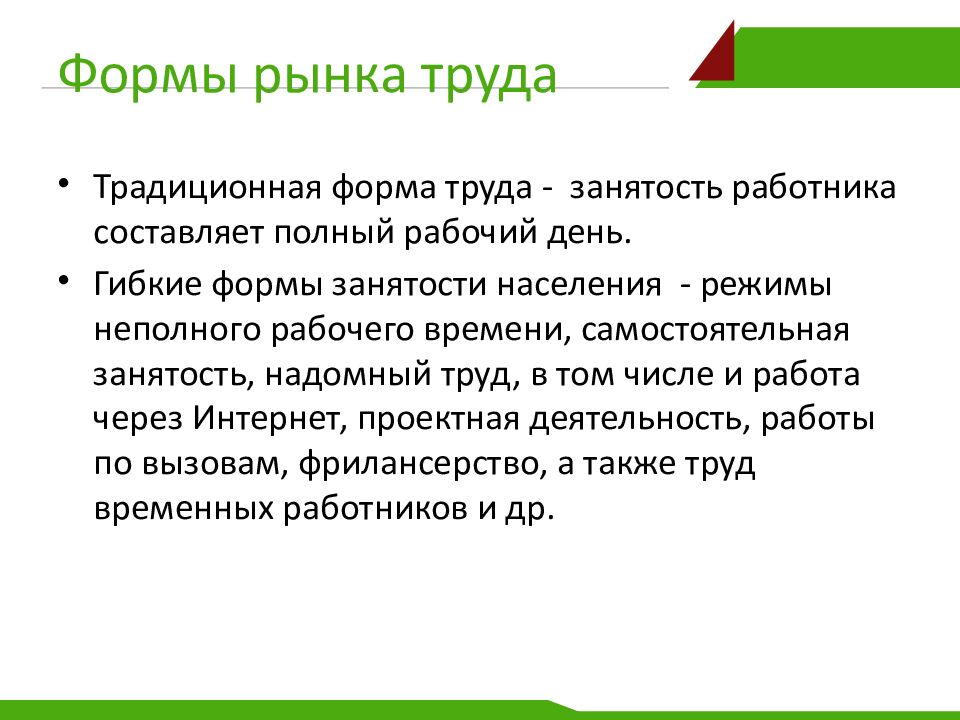 Традиционная форма труда - занятость работника составляет полный рабочий день. Гибкие формы занятости населения - режимы неполного рабочего времени, самостоятельная занятость, надомный труд, в том числе и работа через Интернет, проектная деятельность, работы по вызовам, фрилансерство, а также труд временных работников и др.