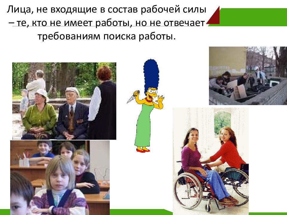 Слайд 16: Лица, не входящие в состав рабочей силы – те, кто не имеет работы, но не отвечает требованиям поиска работы