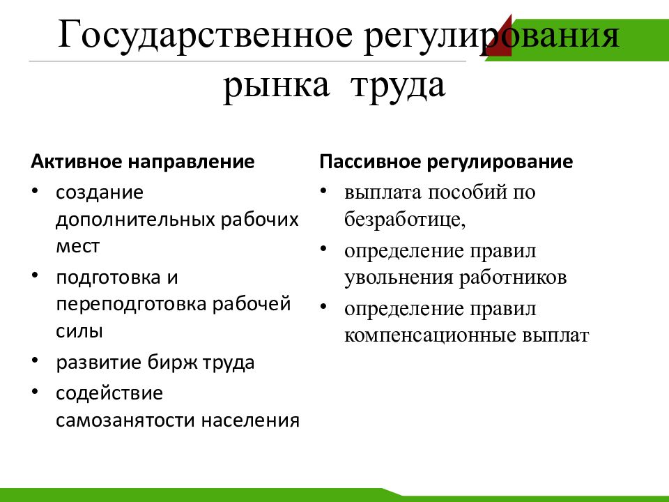 Активное направление создание дополнительных рабочих мест подготовка и переподготовка рабочей силы развитие бирж труда содействие самозанятости населения Пассивное регулирование выплат а пособий по безработице, определение правил увольнения работников определение правил компенсационны е выплат