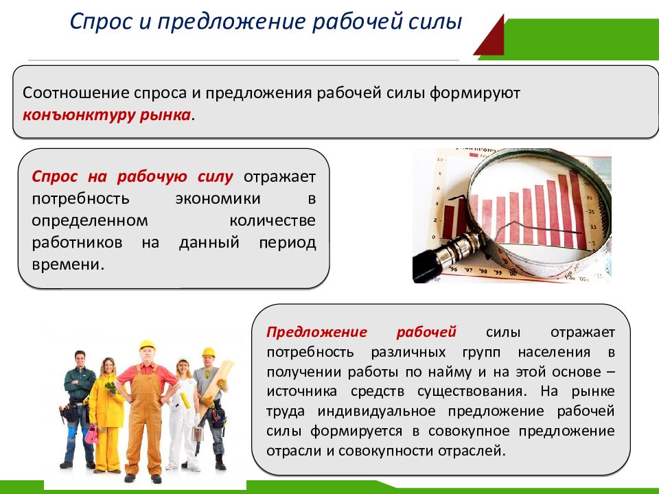 Соотношение спроса и предложения рабочей силы формируют конъюнктуру рынка. Спрос на рабочую силу отражает потребность экономики в определенном количестве работников на данный период времени. Предложение рабочей силы отражает потребность различных групп населения в получении работы по найму и на этой основе – источника средств существования. На рынке труда индивидуальное предложение рабочей силы формируется в совокупное предложение отрасли и совокупности отраслей.