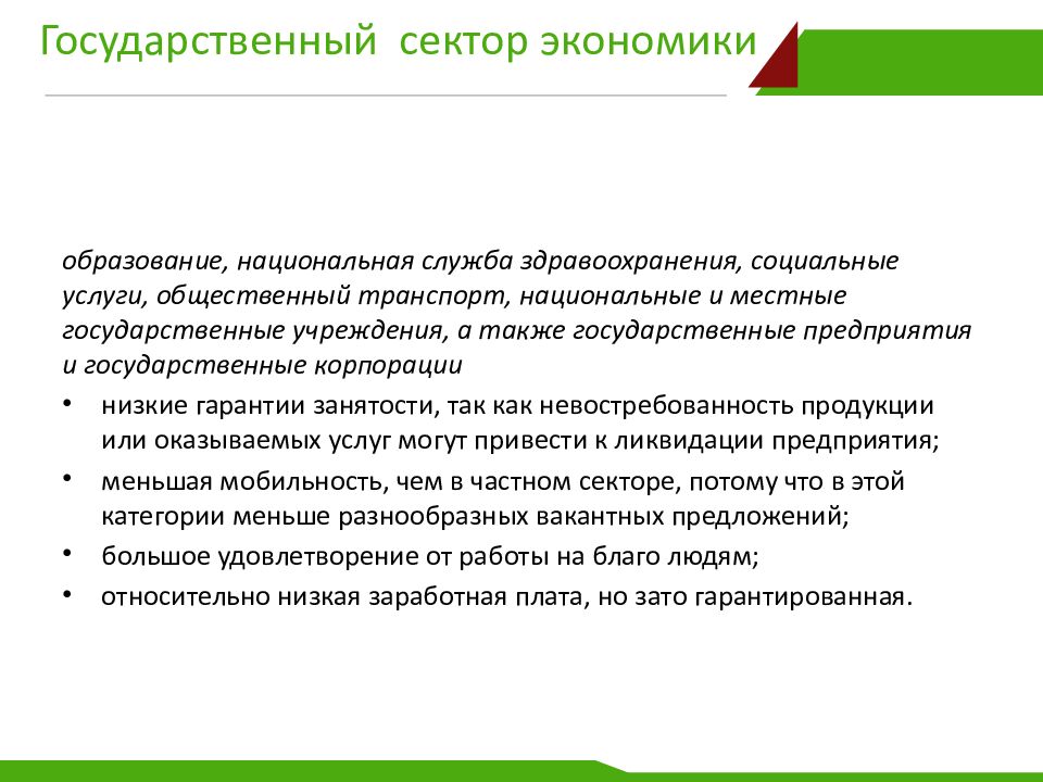 образование, национальная служба здравоохранения, социальные услуги, общественный транспорт, национальные и местные государственные учреждения, а также государственные предприятия и государственные корпорации низкие гарантии занятости, так как невостребованность продукции или оказываемых услуг могут привести к ликвидации предприятия; меньшая мобильность, чем в частном секторе, потому что в этой категории меньше разнообразных вакантных предложений; большое удовлетворение от работы на благо людям; относительно низкая заработная плата, но зато гарантированная.