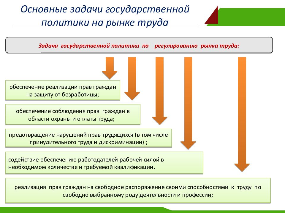 Задачи государственной политики по регулированию рынка труда: реализация прав граждан на свободное распоряжение своими способностями к труду по свободно выбранному роду деятельности и профессии; обеспечение реализации прав граждан на защиту от безработицы; обеспечение соблюдения прав граждан в области охраны и оплаты труда; предотвращение нарушений прав трудящихся (в том числе принудительного труда и дискриминации) ; содействие обеспечению работодателей рабочей силой в необходимом количестве и требуемой квалификации.