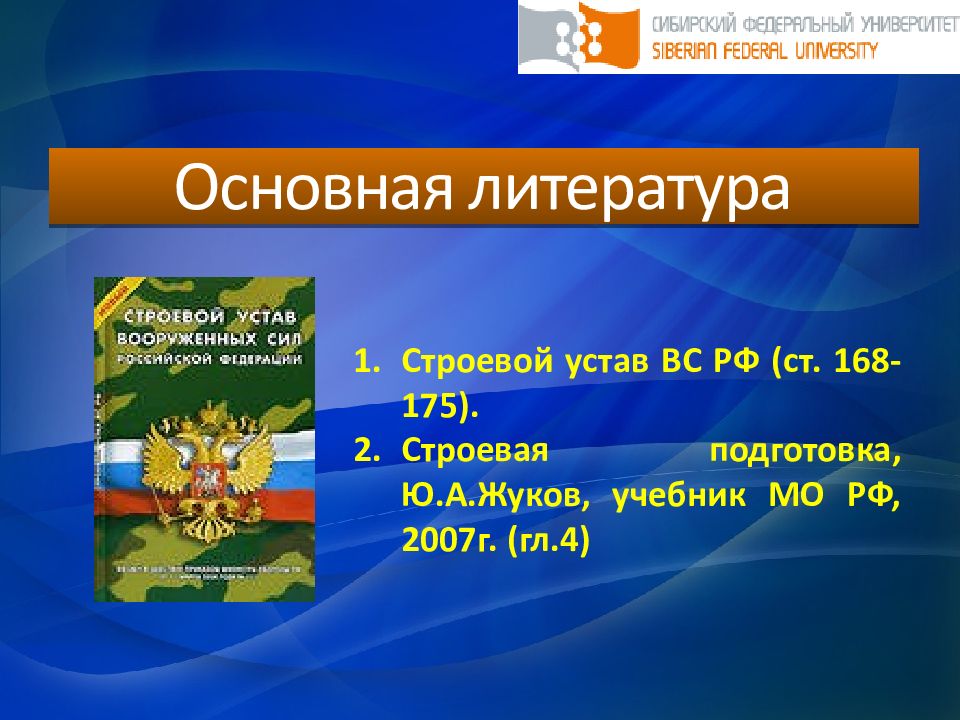Основная литература Строевой устав ВС РФ (ст. 168-175). Строевая подготовка, Ю.А.Жуков, учебник МО РФ, 2007г. (гл.4)