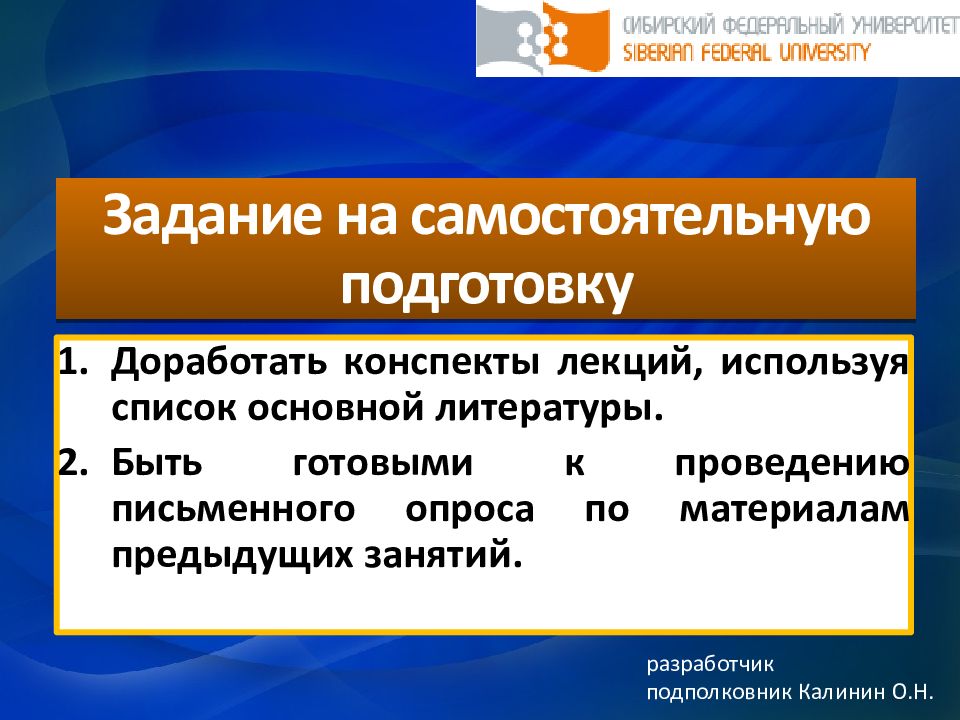 Доработать конспекты лекций, используя список основной литературы. Быть готовыми к проведению письменного опроса по материалам предыдущих занятий. разработчик подполковник Калинин О.Н.