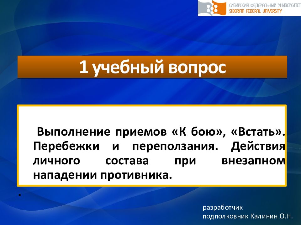 Выполнение приемов «К бою», «Встать». Перебежки и переползания. Действия личного состава при внезапном нападении противника. . разработчик подполковник Калинин О.Н.