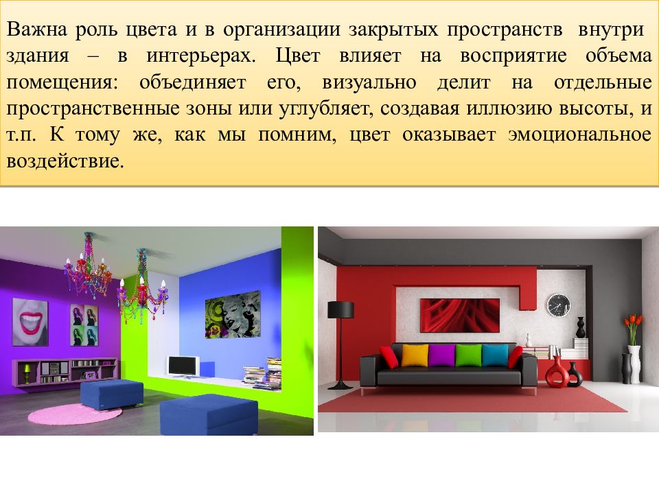 Важна роль цвета и в организации закрытых пространств внутри здания – в интерьерах. Цвет влияет на восприятие объема помещения: объединяет его, визуально делит на отдельные пространственные зоны или углубляет, создавая иллюзию высоты, и т.п. К тому же, как мы помним, цвет оказывает эмоциональное воздействие.