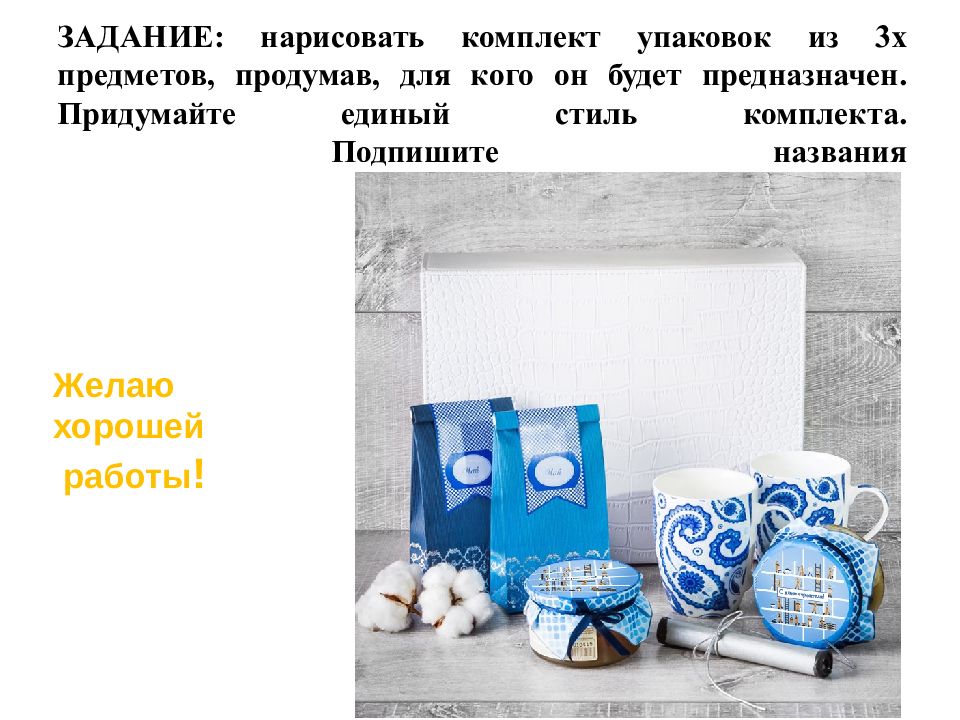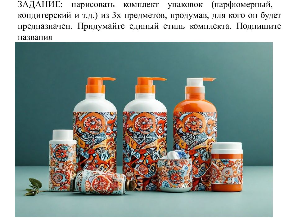 ЗАДАНИЕ: нарисовать комплект упаковок (парфюмерный, канцелярский, кондитерский и т.д.) из 3х предметов, продумав, для кого он будет предназначен. Придумайте единый стиль комплекта.