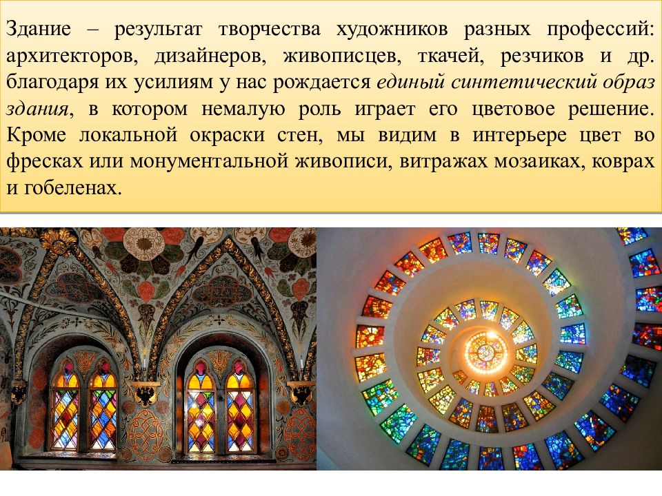 Здание – результат творчества художников разных профессий: архитекторов, дизайнеров, живописцев, ткачей, резчиков и др. благодаря их усилиям у нас рождается единый синтетический образ здания, в котором немалую роль играет его цветовое решение. Кроме локальной окраски стен, мы видим в интерьере цвет во фресках или монументальной живописи, витражах мозаиках, коврах и гобеленах.