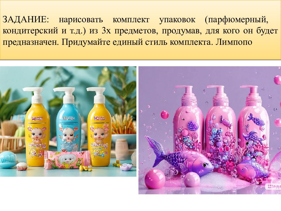 ЗАДАНИЕ: нарисовать комплект упаковок (парфюмерный, кондитерский и т.д.) из 3х предметов, продумав, для кого он будет предназначен. Придумайте единый стиль комплекта. Лимпопо