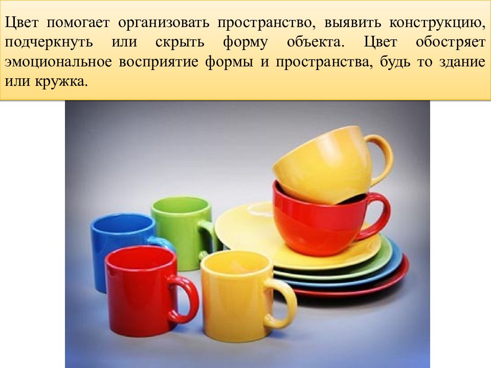 Цвет помогает организовать пространство, выявить конструкцию, подчеркнуть или скрыть форму объекта. Цвет обостряет эмоциональное восприятие формы и пространства, будь то здание или кружка.