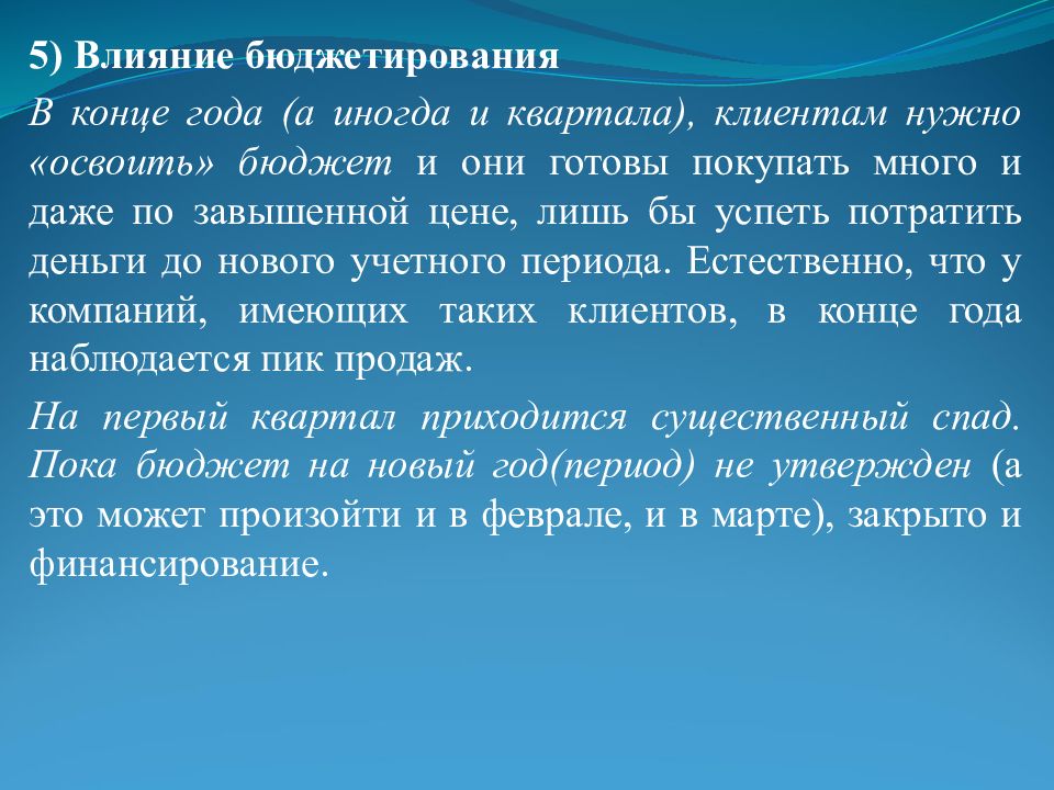 5) Влияние бюджетирования В конце года (а иногда и квартала), клиентам нужно «освоить» бюджет и они готовы покупать много и даже по завышенной цене, лишь бы успеть потратить деньги до нового учетного периода. Естественно, что у компаний, имеющих таких клиентов, в конце года наблюдается пик продаж. На первый квартал приходится существенный спад. Пока бюджет на новый год(период) не утвержден (а это может произойти и в феврале, и в марте), закрыто и финансирование.