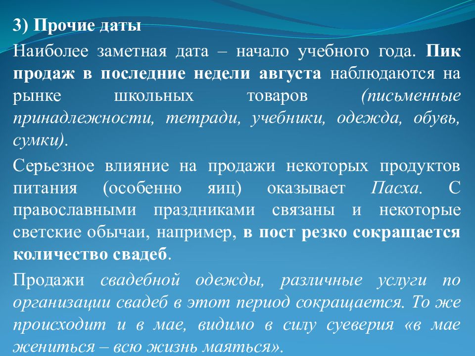 3) Прочие даты Наиболее заметная дата – начало учебного года. Пик продаж в последние недели августа наблюдаются на рынке школьных товаров (письменные принадлежности, тетради, учебники, одежда, обувь, сумки). Серьезное влияние на продажи некоторых продуктов питания (особенно яиц) оказывает Пасха. С православными праздниками связаны и некоторые светские обычаи, например, в пост резко сокращается количество свадеб. Продажи свадебной одежды, различные услуги по организации свадеб в этот период сокращается. То же происходит и в мае, видимо в силу суеверия «в мае жениться – всю жизнь маяться».